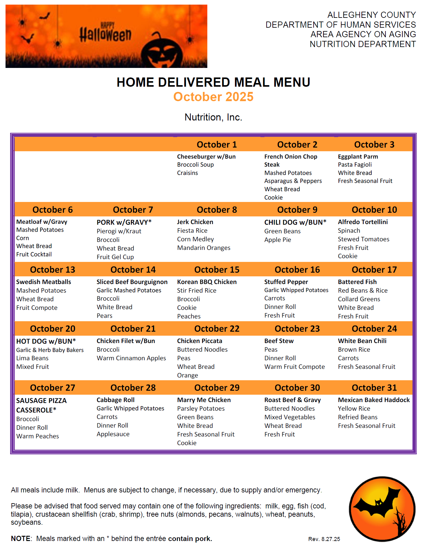 HDM / MOW Monthly Menus The Allegheny County Department of Human Services Area Agency on Aging Nutrition Services provides the monthly menu items. October 2025 MOW Menu