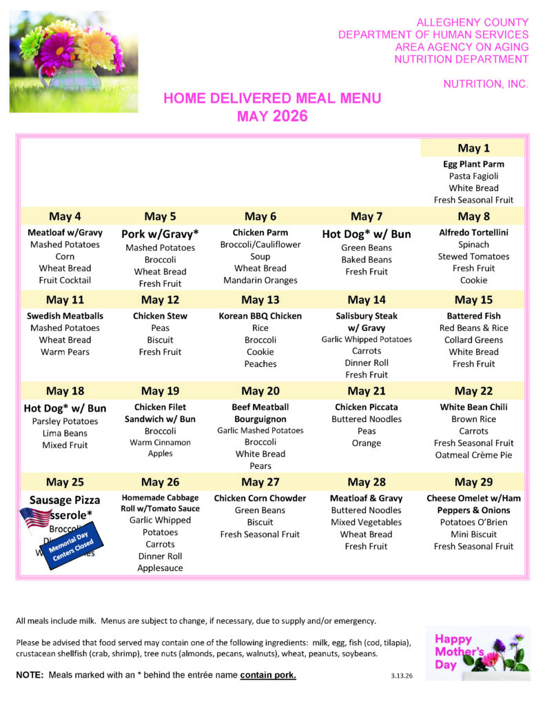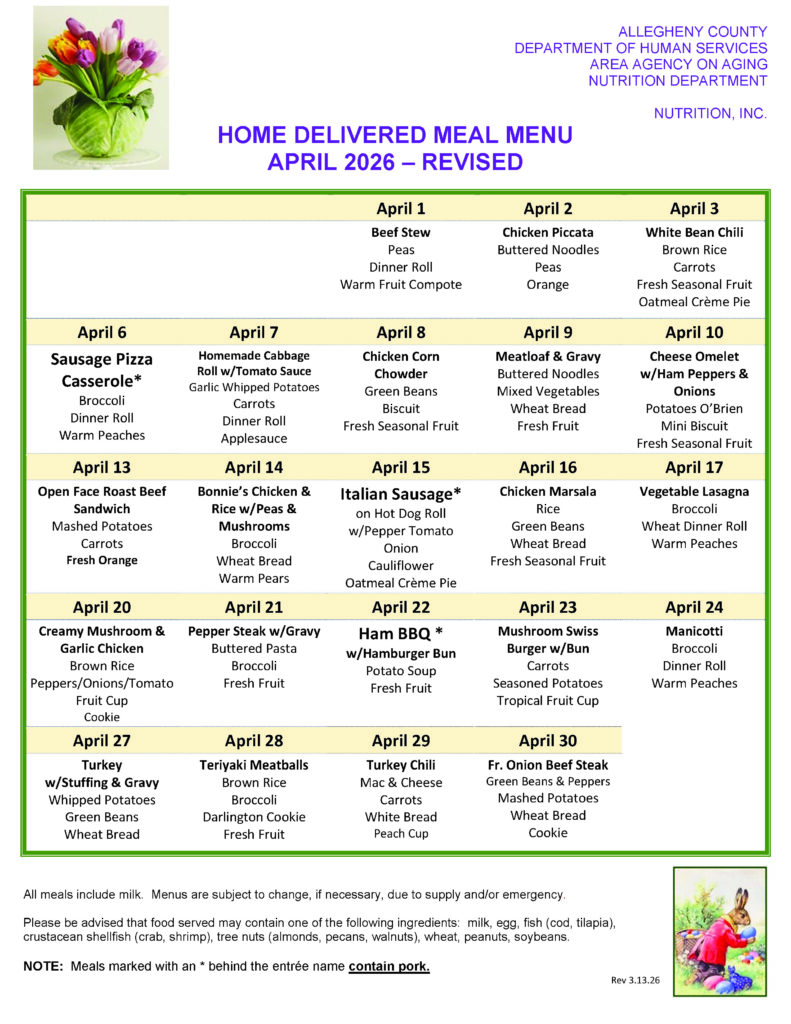 HDM / MOW Monthly Menus The Allegheny County Department of Human Services Area Agency on Aging Nutrition Services provides the monthly menu items.